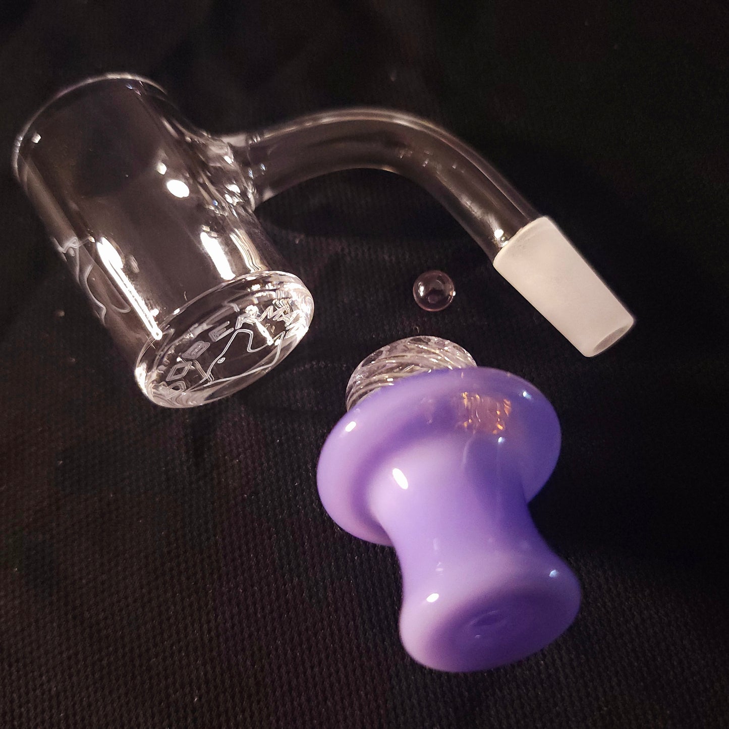 Featuring a 25x40mm "standard" banger with a 4mm thick bottom paired with a gorgeous violet spinner carb cap and pink terp pearl. The Elora set is where simple, elegant and extremely effective.