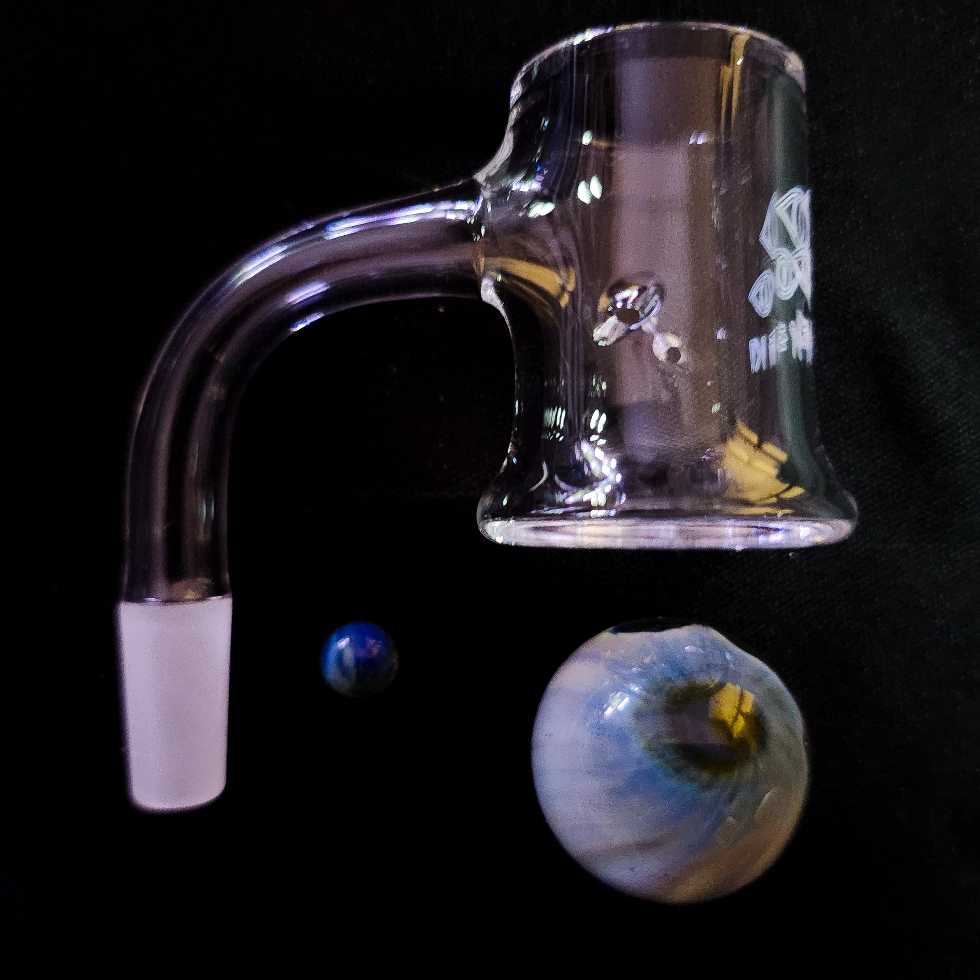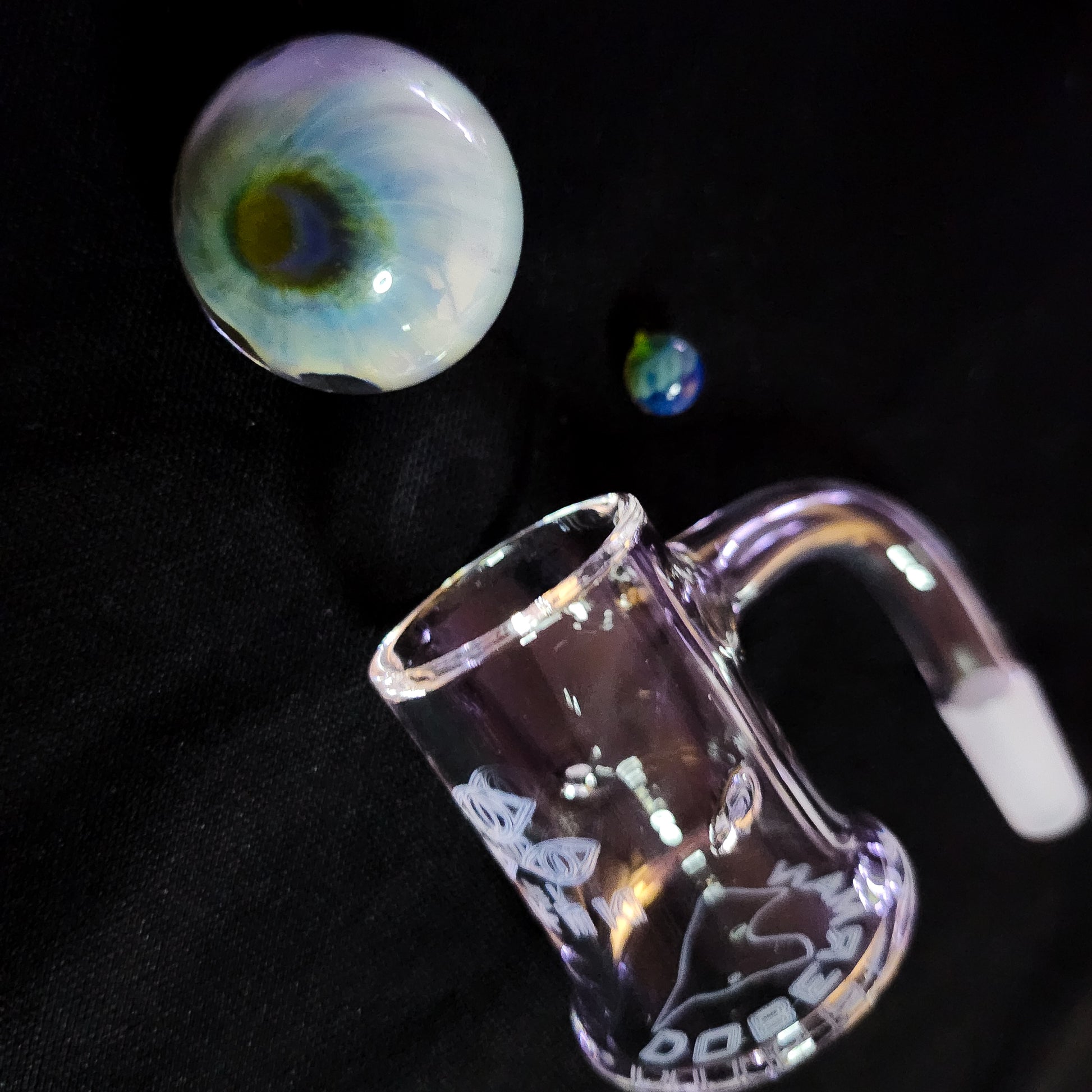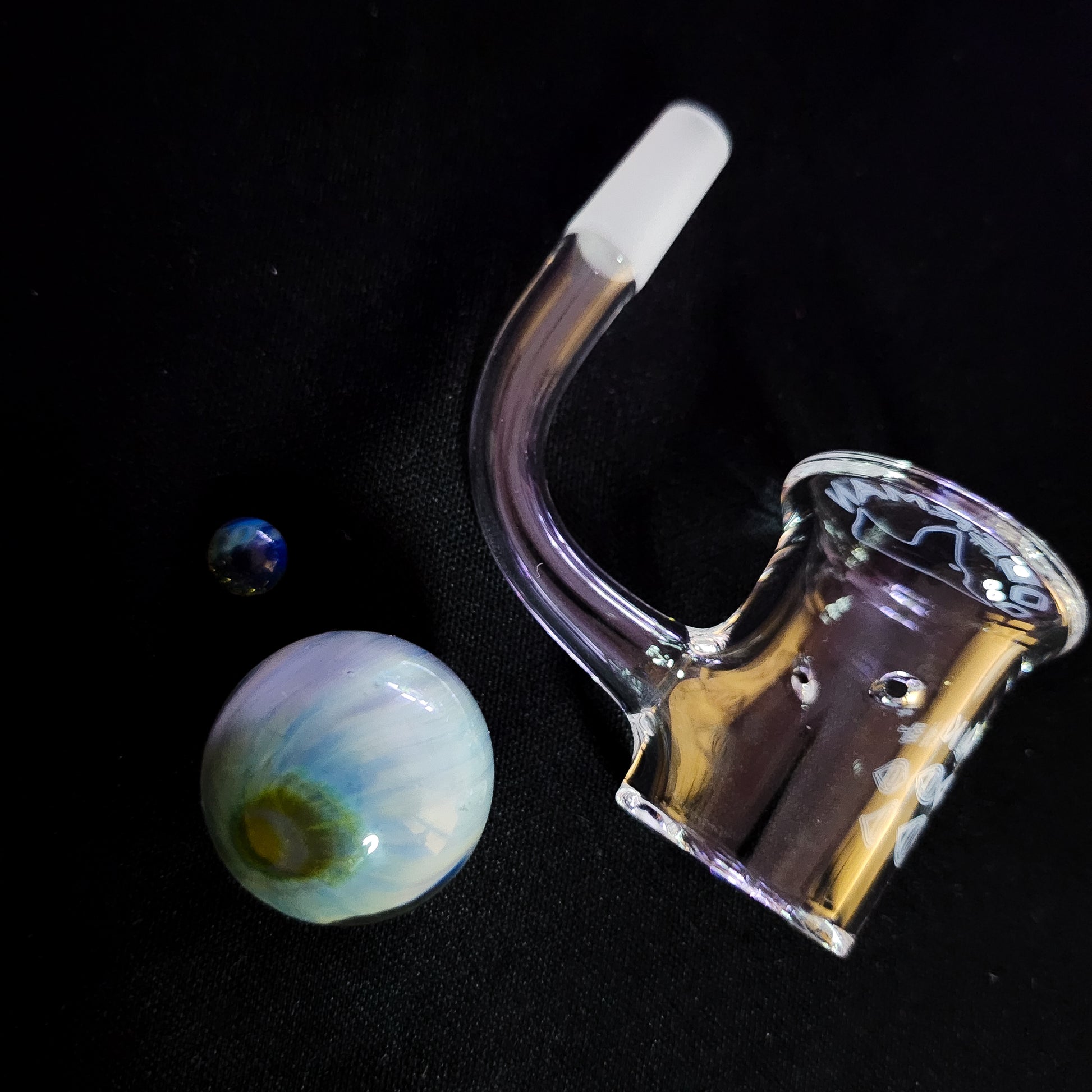 The Demon is paired with our Canadian made "Ethereal" marble carb cap & pearl set from Guya Glass, each piece is unique and magnificent.