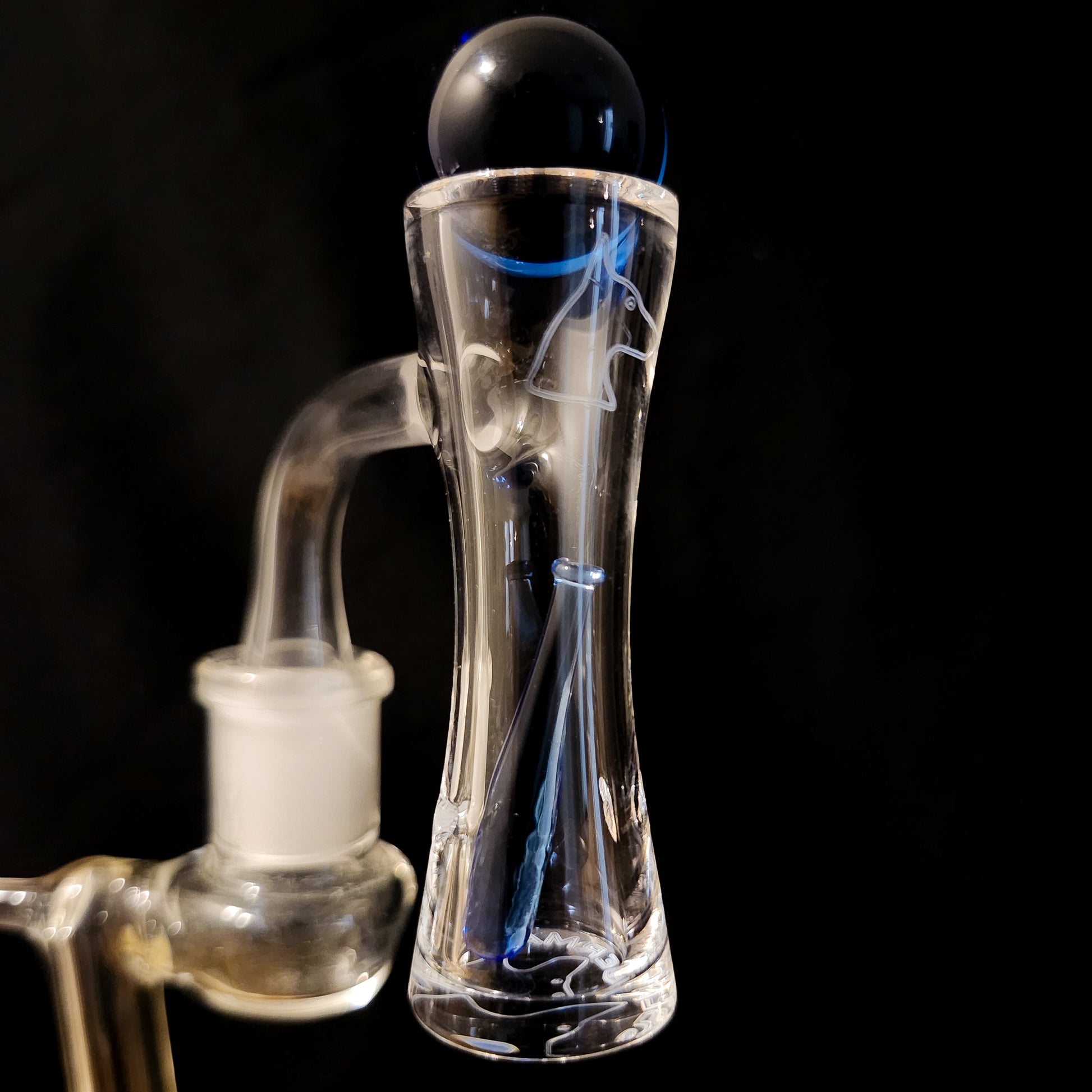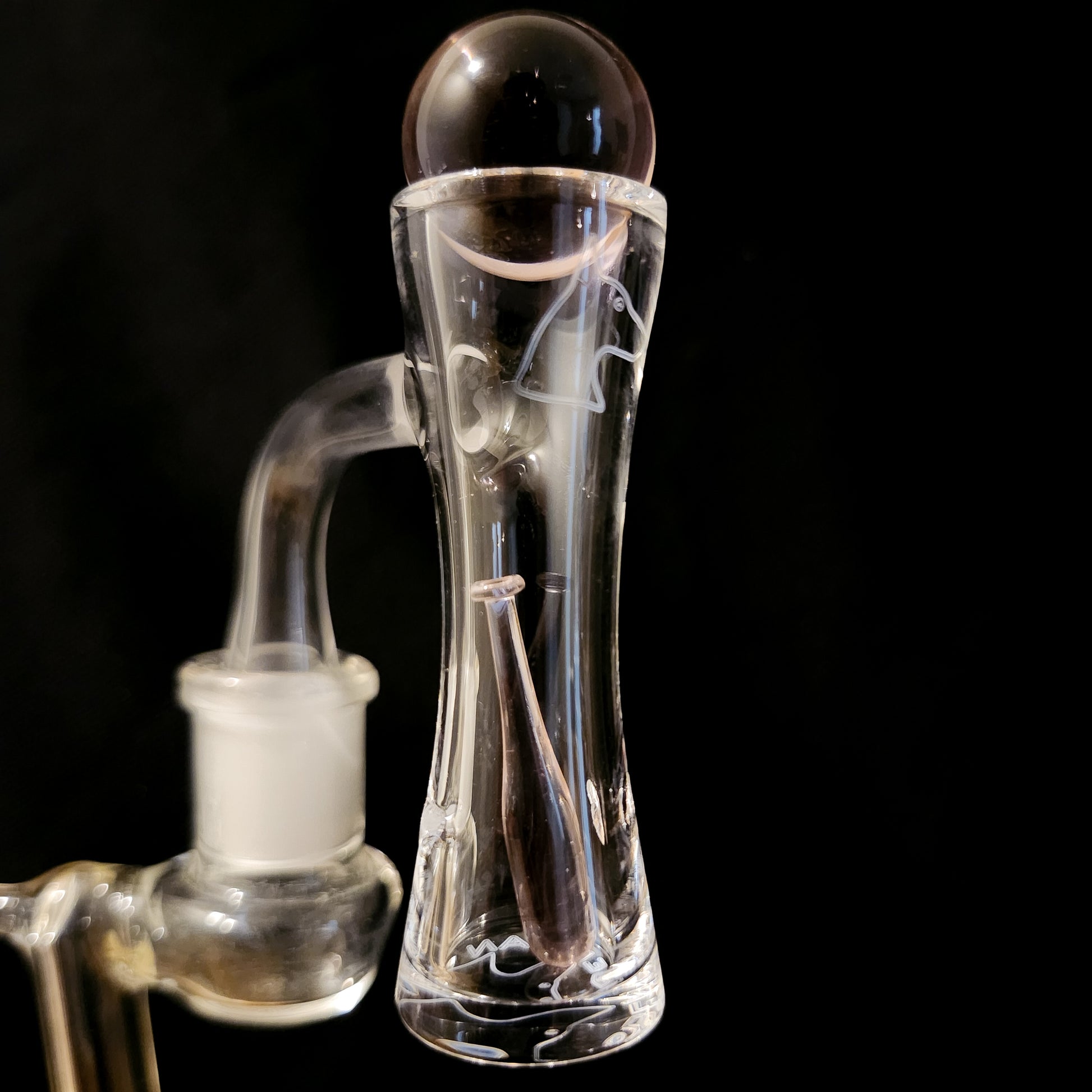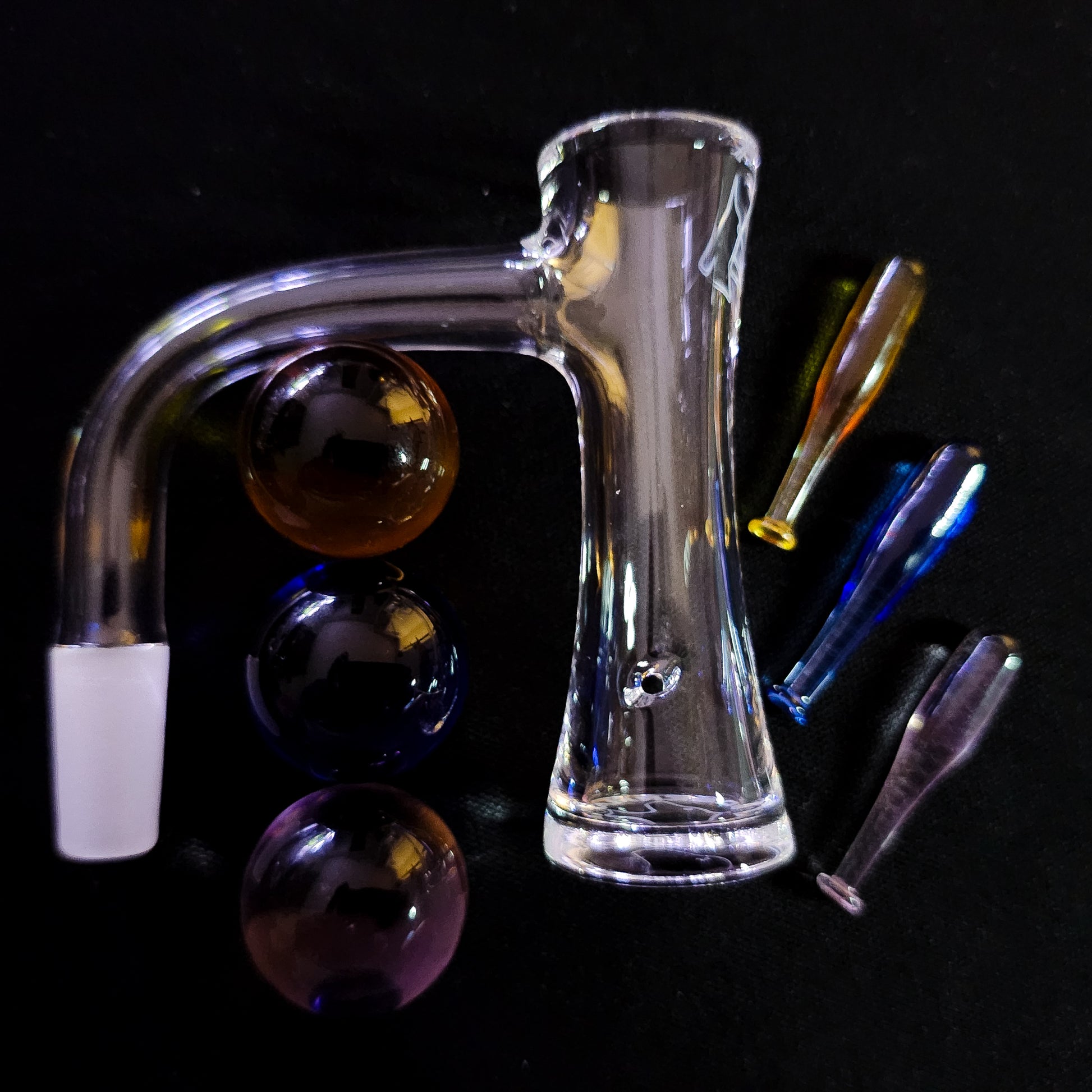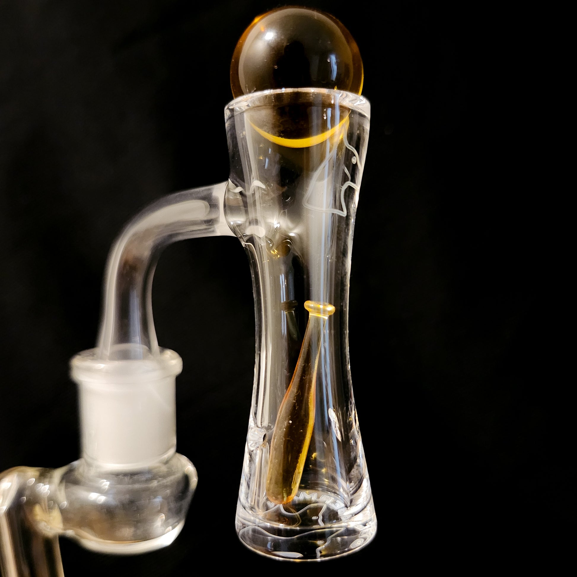 Featuring a quartz hourglass auto-spinner full-weld banger paired tastefully with a 22mm glass carb cap & baseball-bat pillar finished in your choice of pink, blue & amber (works well with single 6 or 8mm round beads too). Truly a unique piece offering a fantastic experience every time.