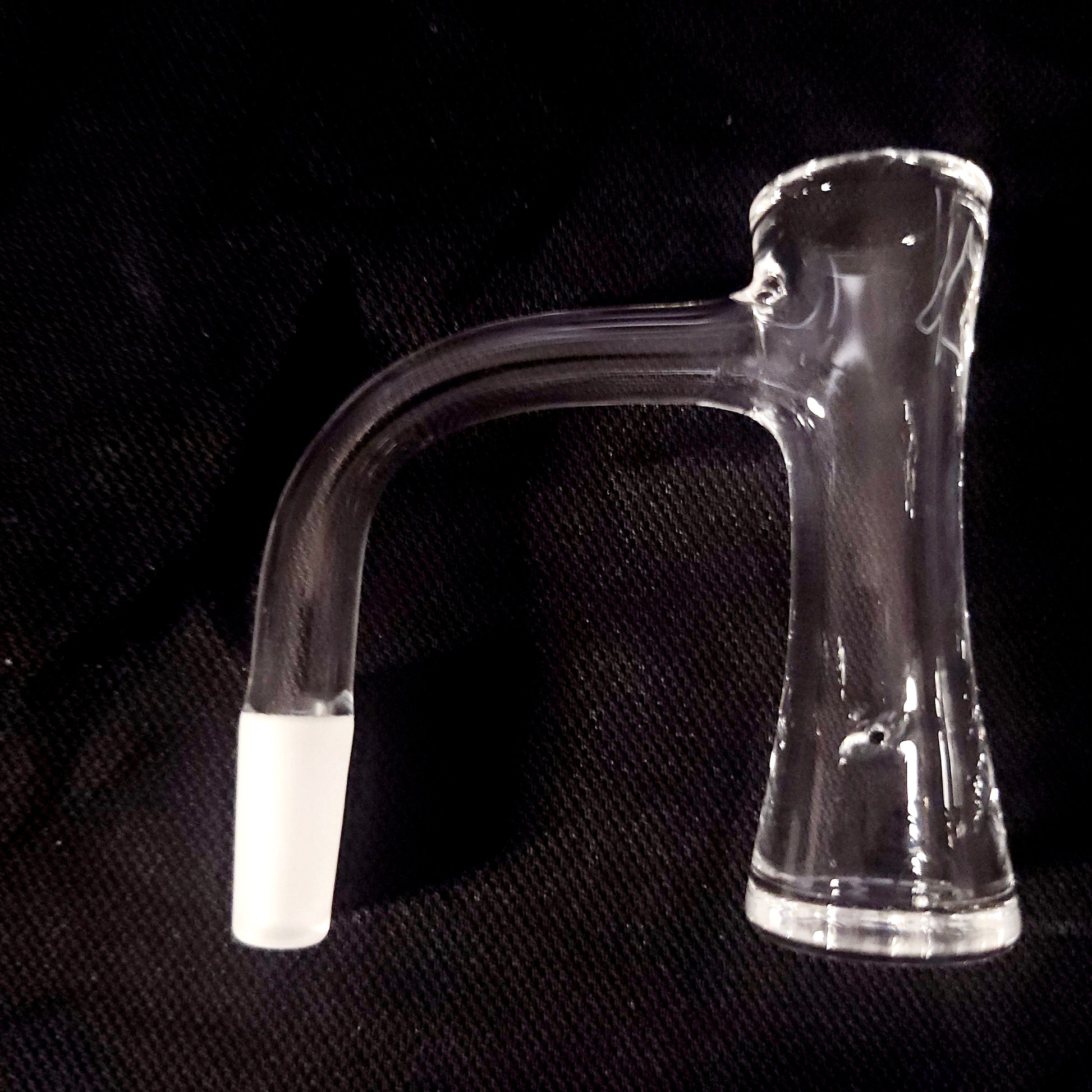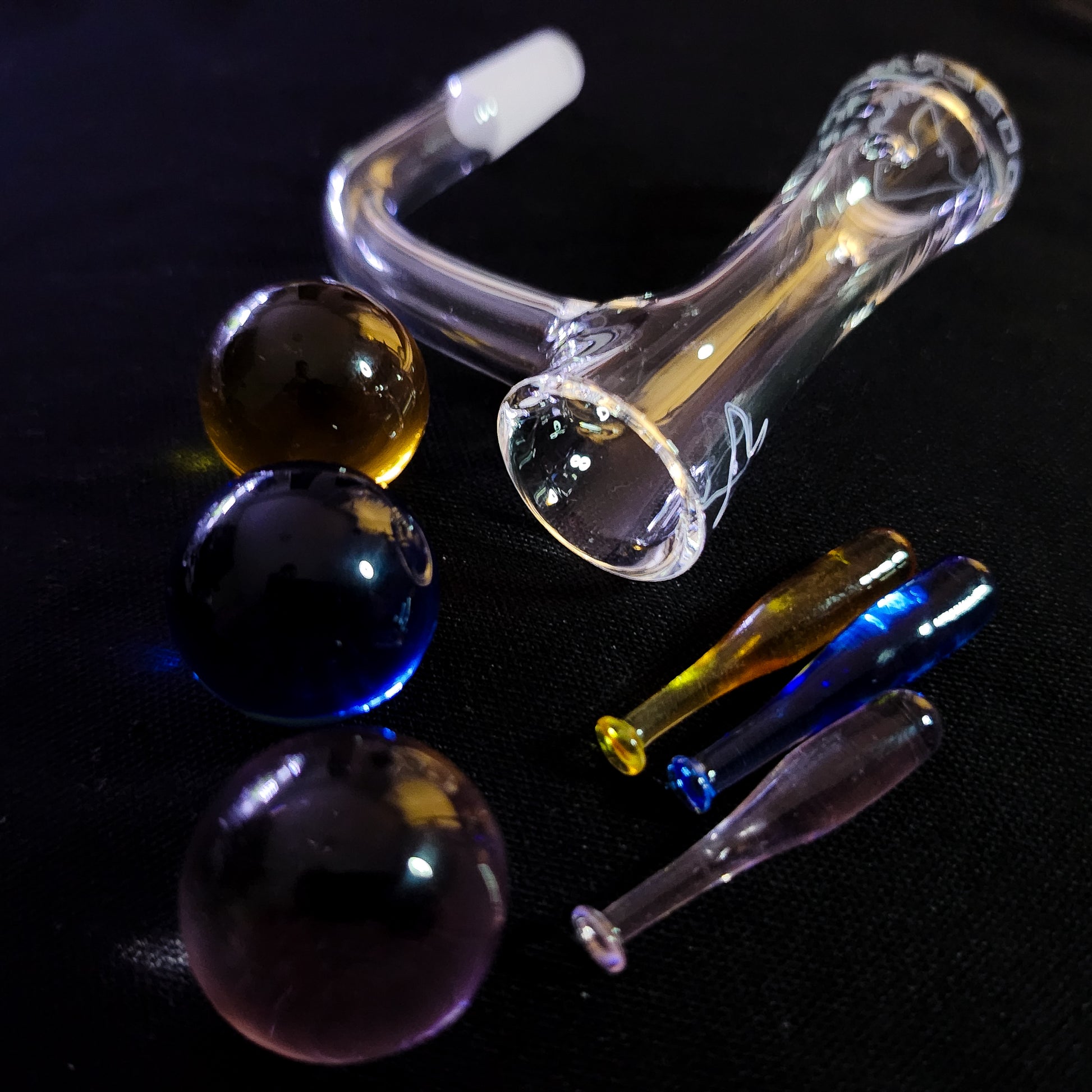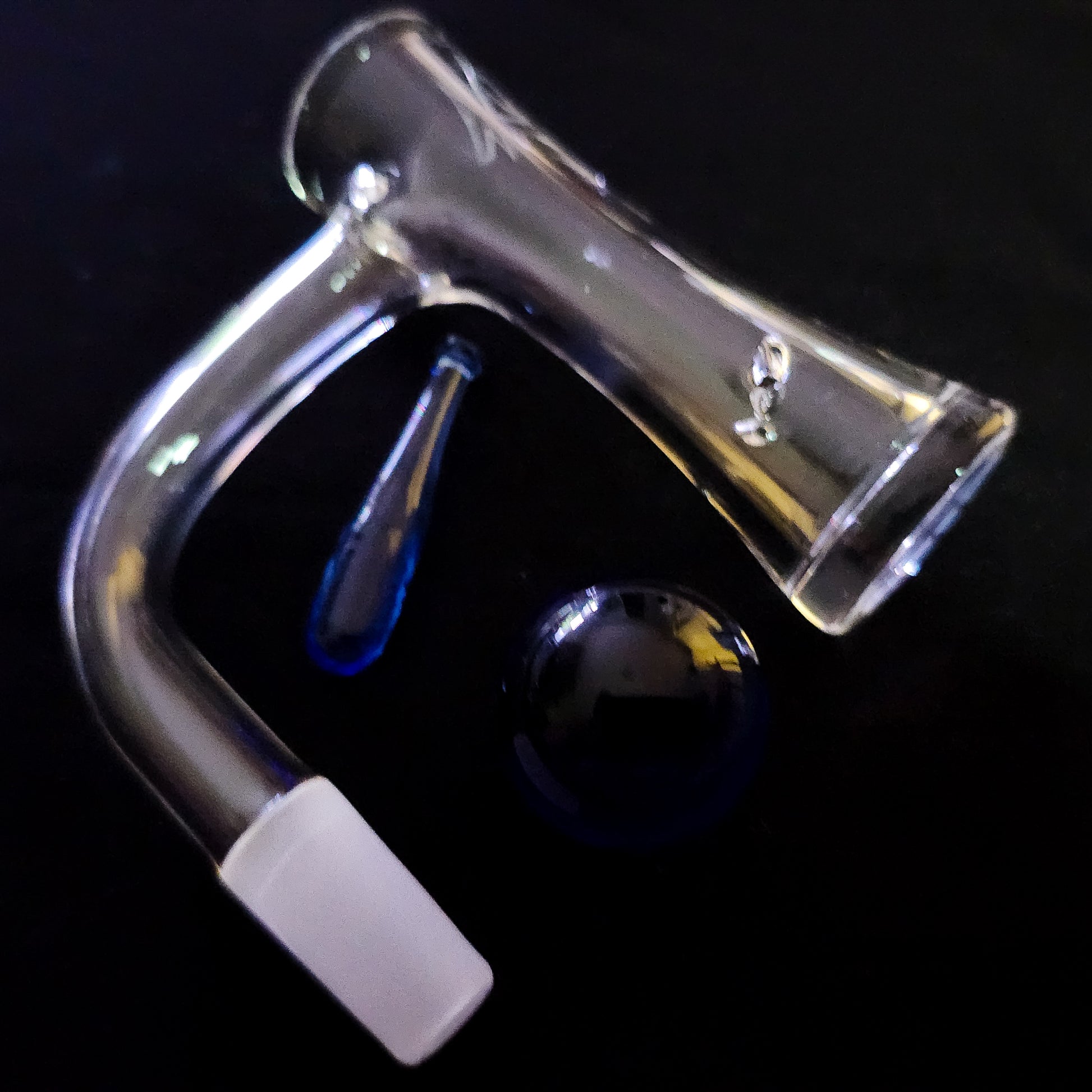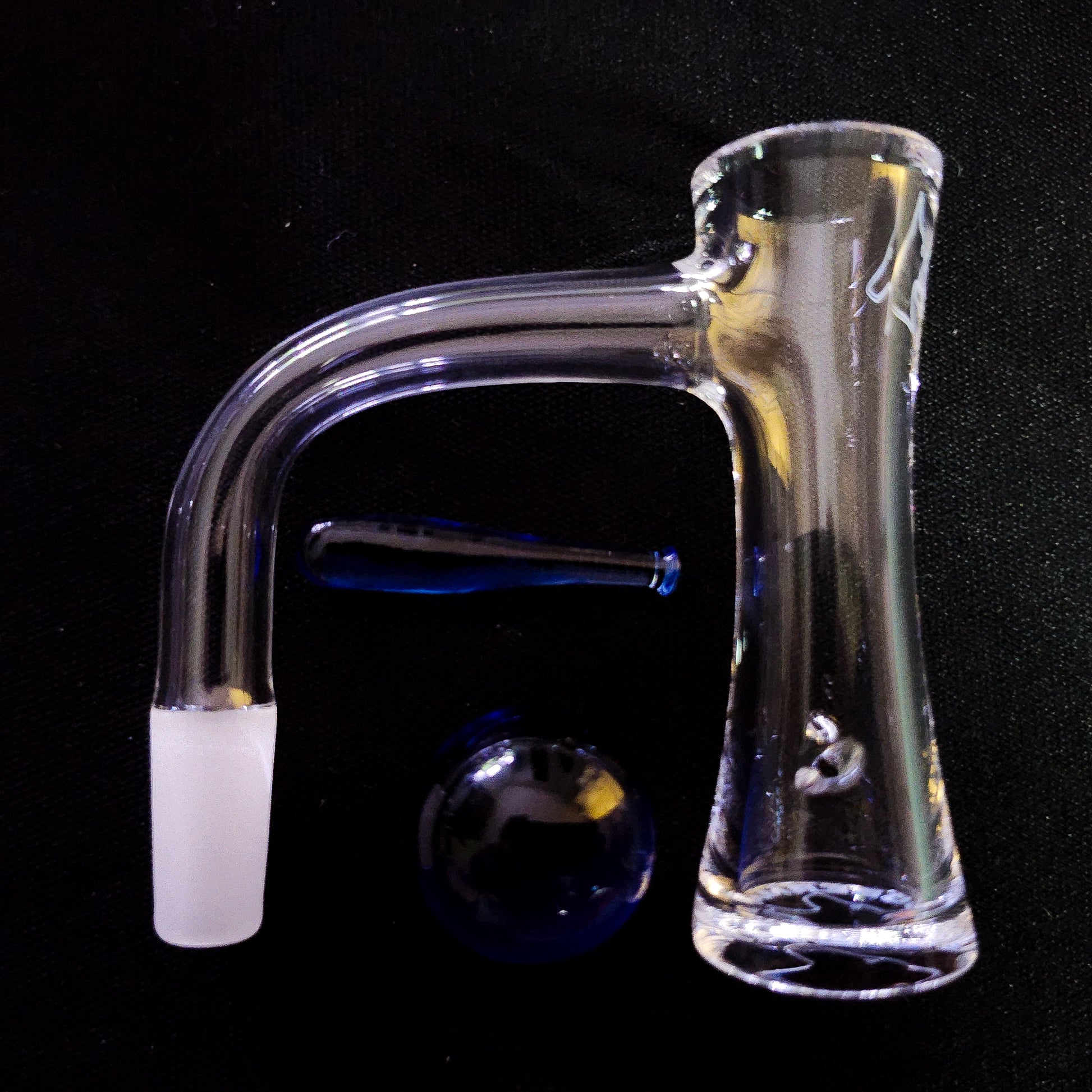 Featuring a quartz hourglass auto-spinner full-weld banger paired tastefully with a 22mm glass carb cap & baseball-bat pillar finished in your choice of pink, blue & amber (works well with single 6 or 8mm round beads too). Truly a unique piece offering a fantastic experience every time.