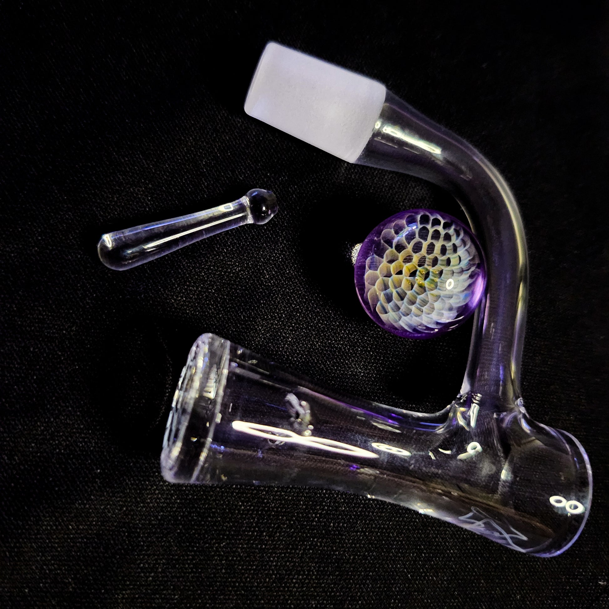 Featuring a quartz hourglass auto-spinner full-weld banger paired with an elegant 22mm honeycomb sphere (available in your choice of purple & amber) & the torpedo pillar (works well with single 6 or 8mm round beads too), a gorgeous and functional set.