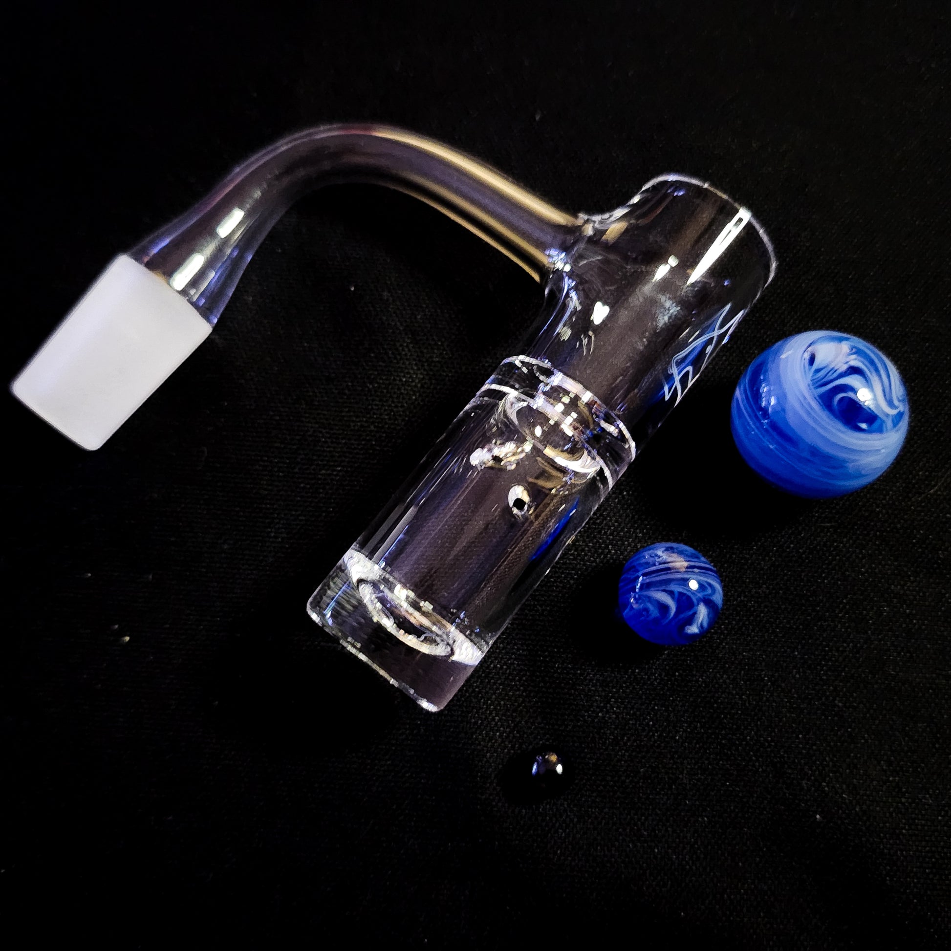 Equipped with a 20x80mm hybrid dual-chamber quartz round-bottom auto-spinner banger paired with our planetary marble sets. Extremely effective in function while maintaining a classy mysterious look.