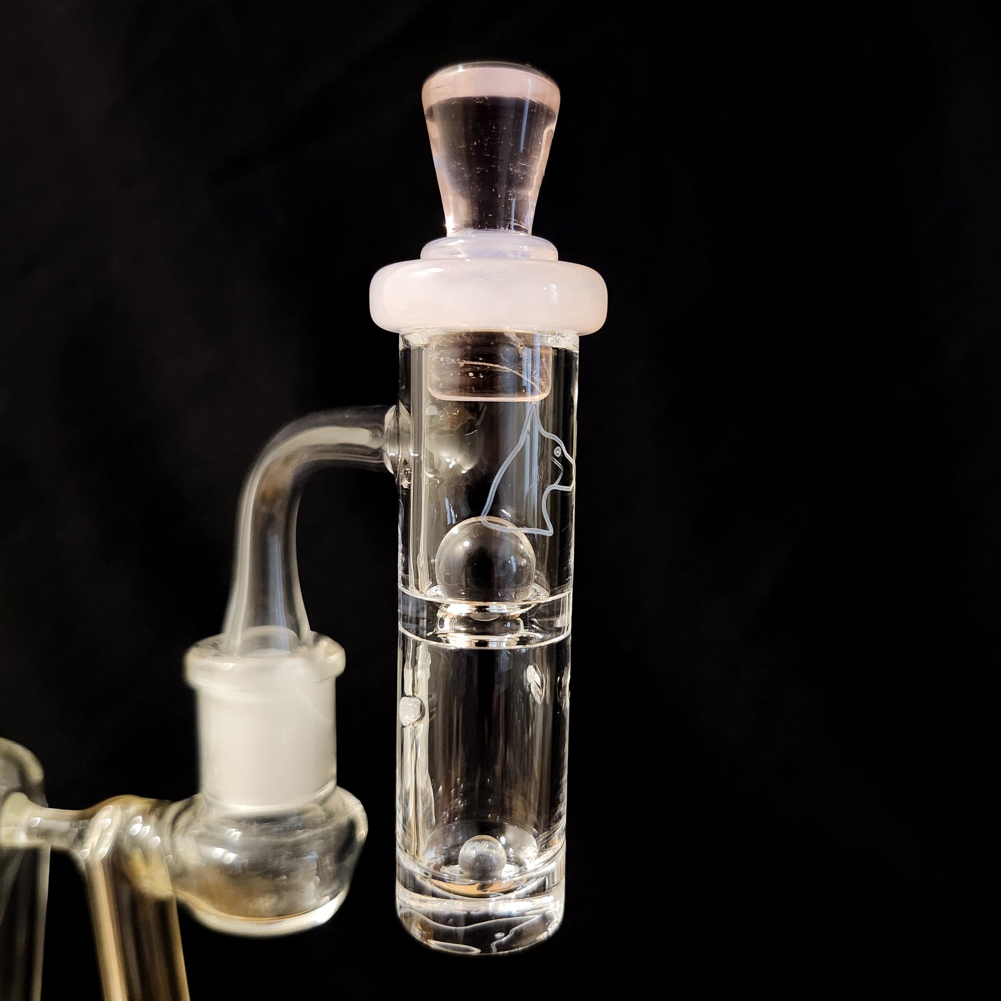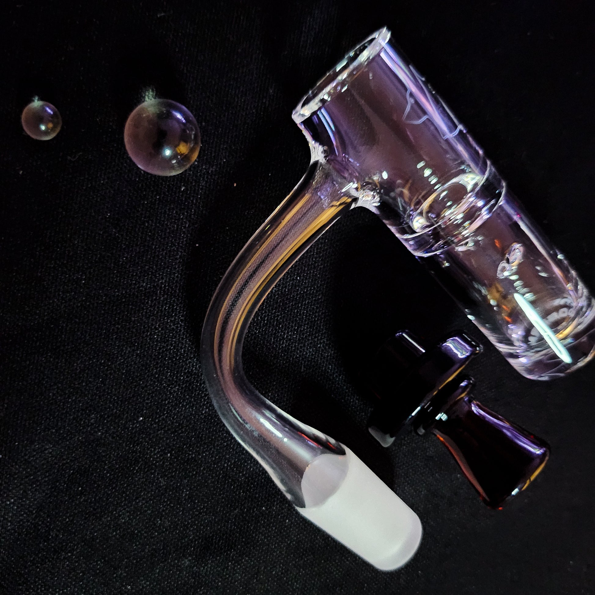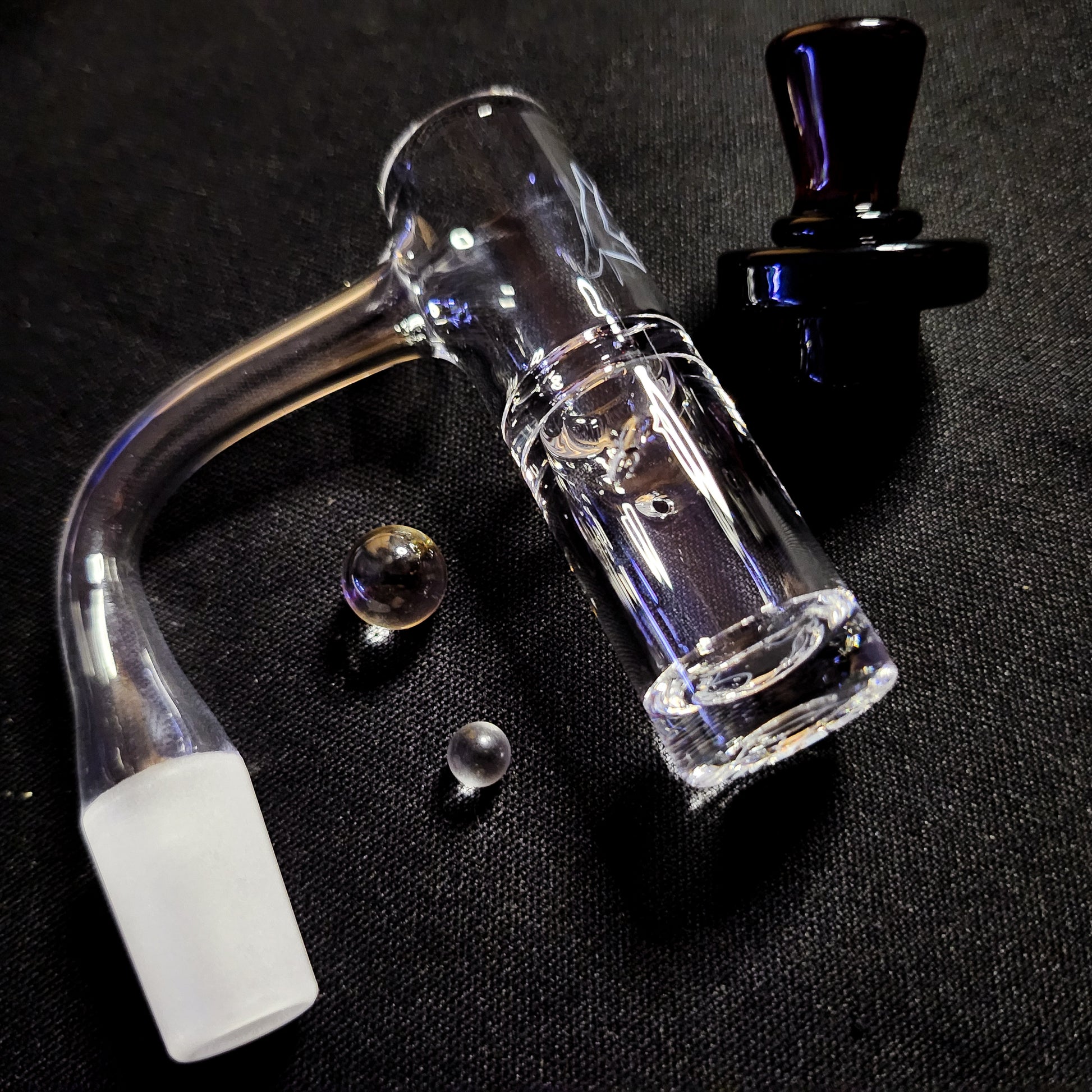 Equipped with a 20x80mm hybrid dual-chamber quartz round-bottom auto-spinner banger paired with our Colour Top-cap set, a functional and handsome addition to your quartz collection.