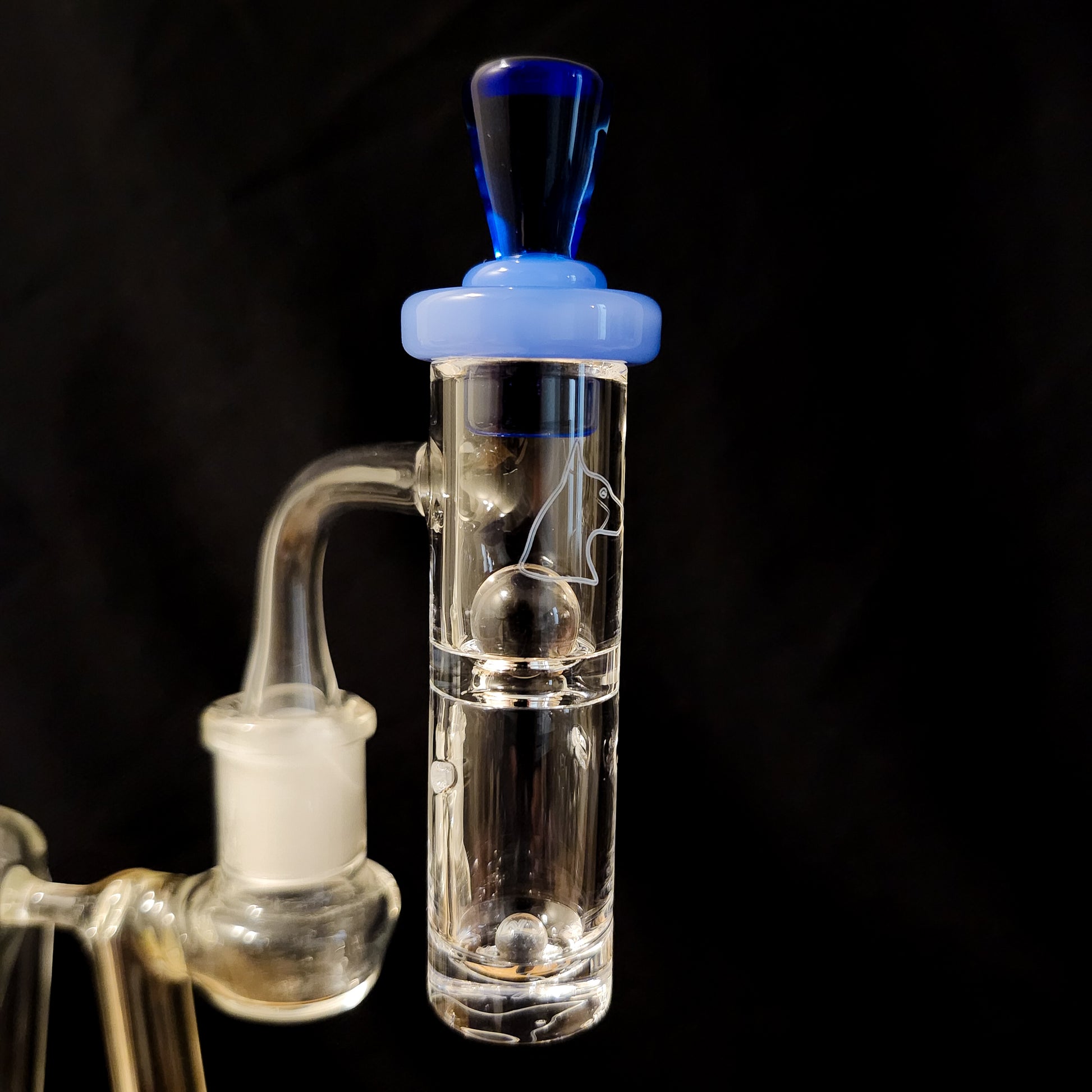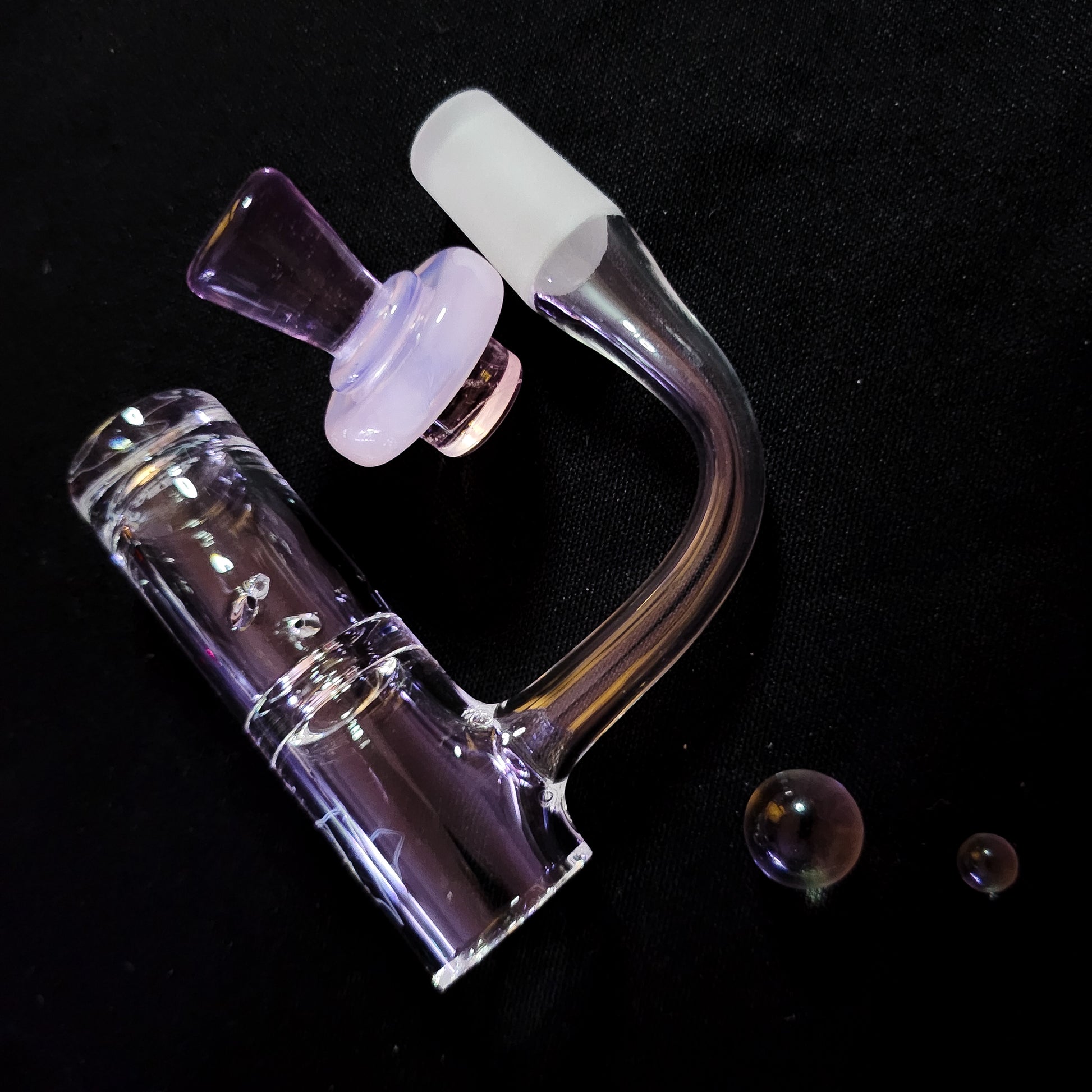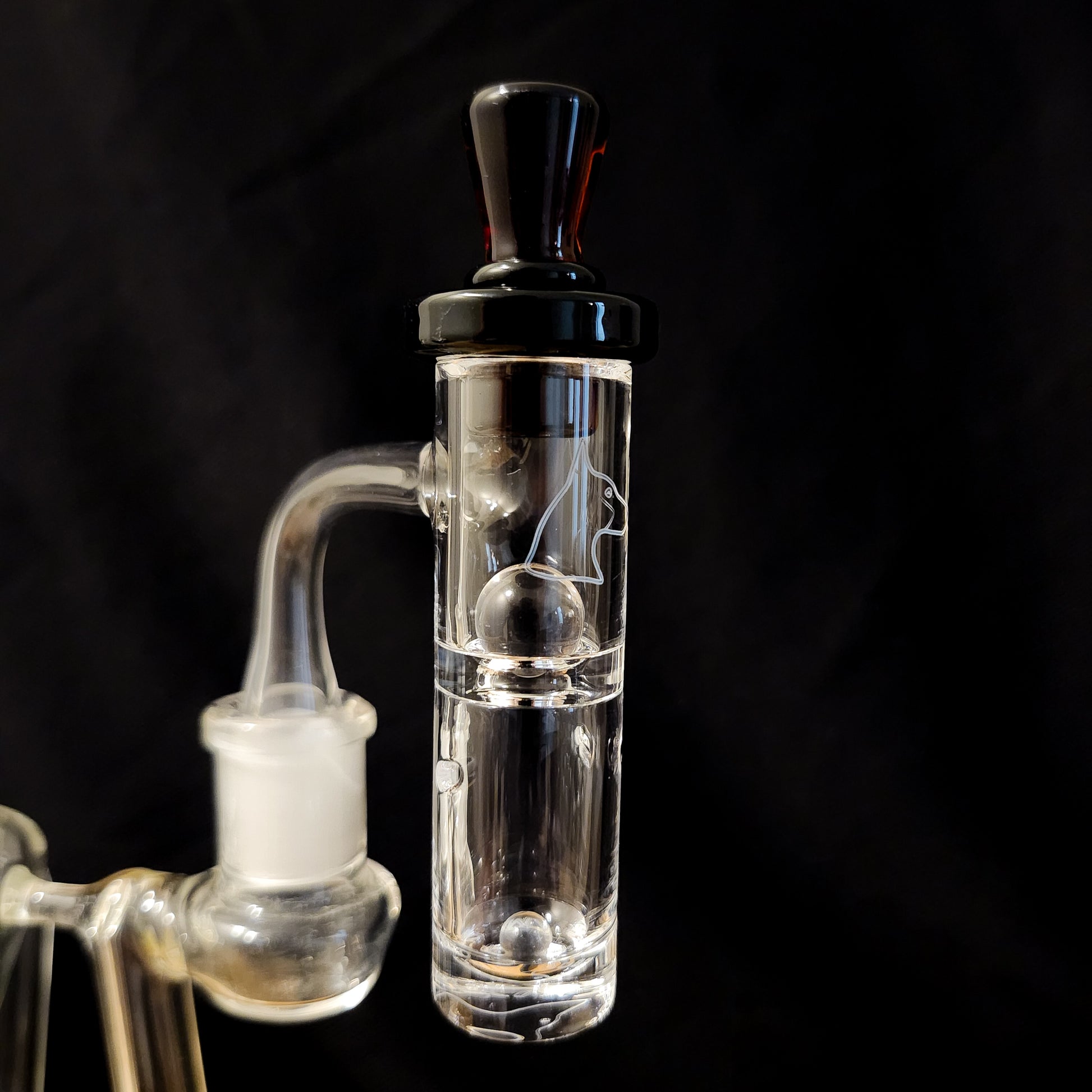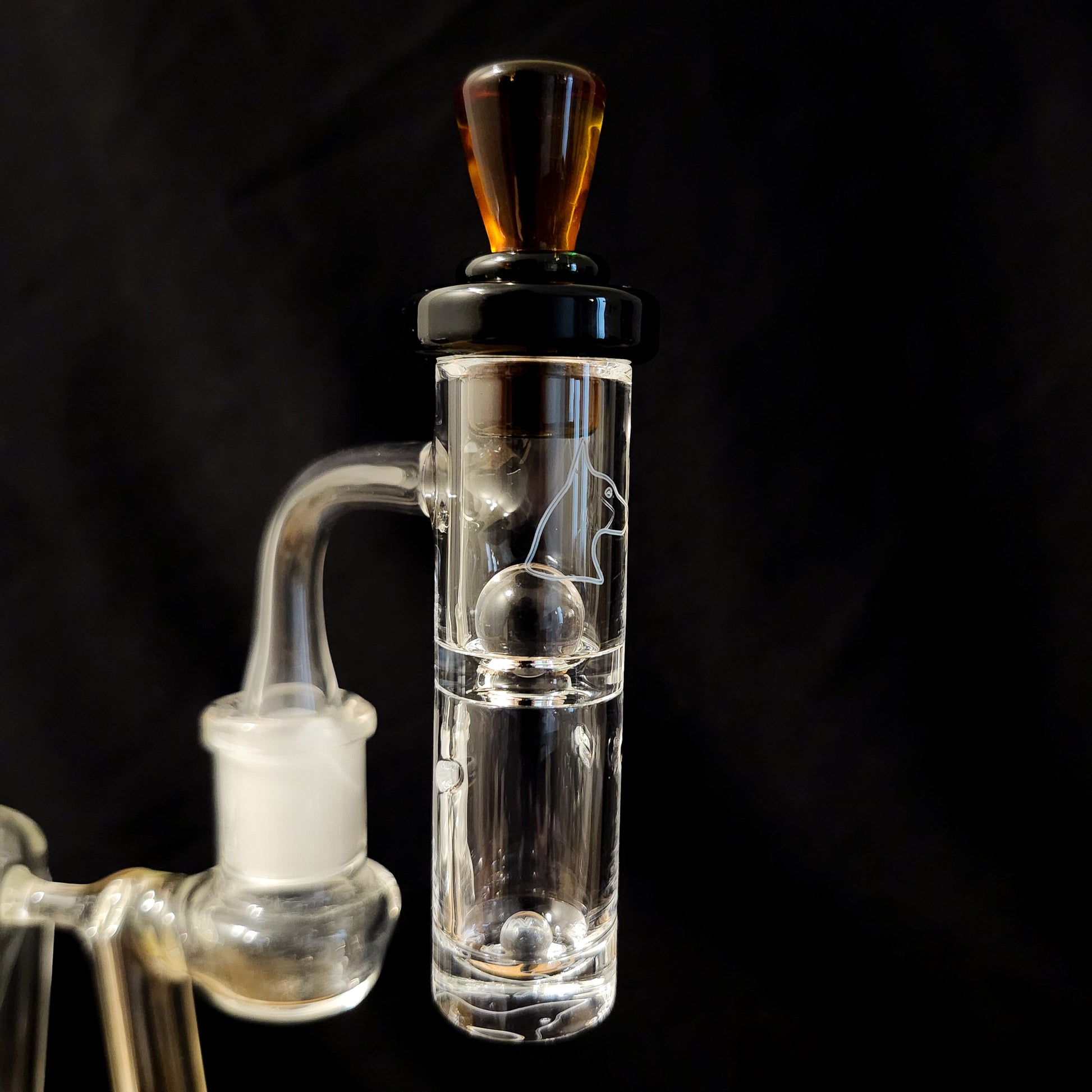 Equipped with a 20x80mm hybrid dual-chamber quartz round-bottom auto-spinner banger paired with our Colour Top-cap set, a functional and handsome addition to your quartz collection.