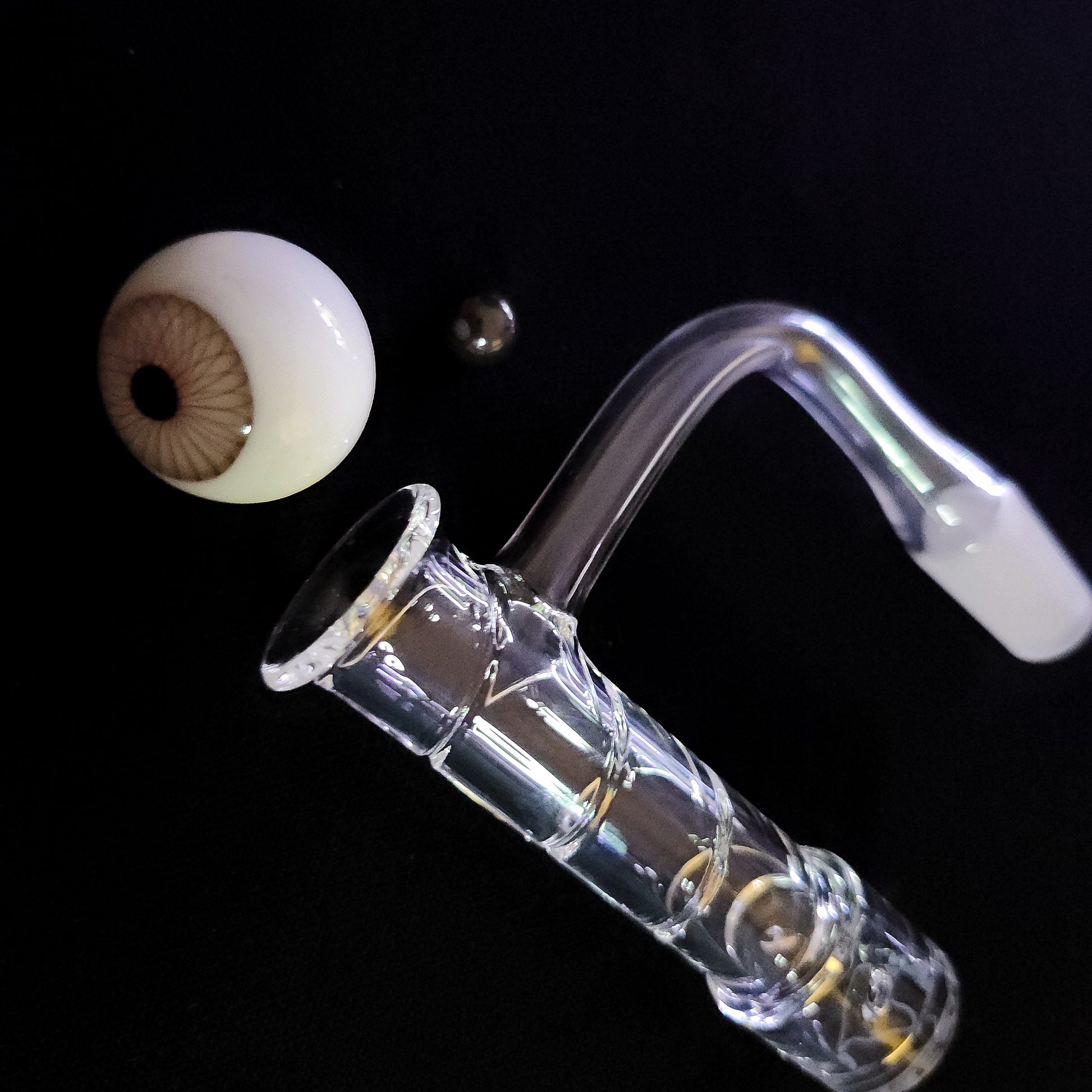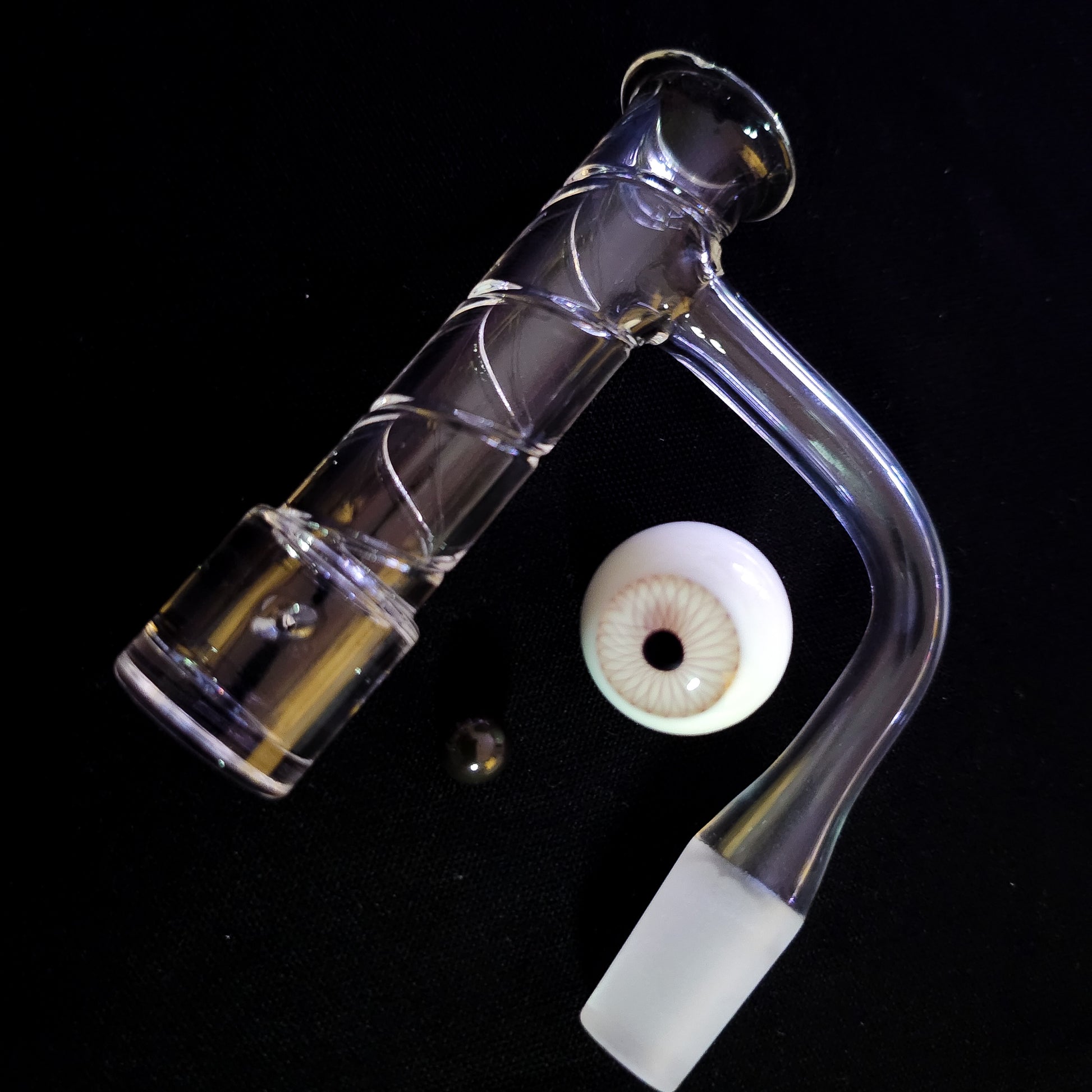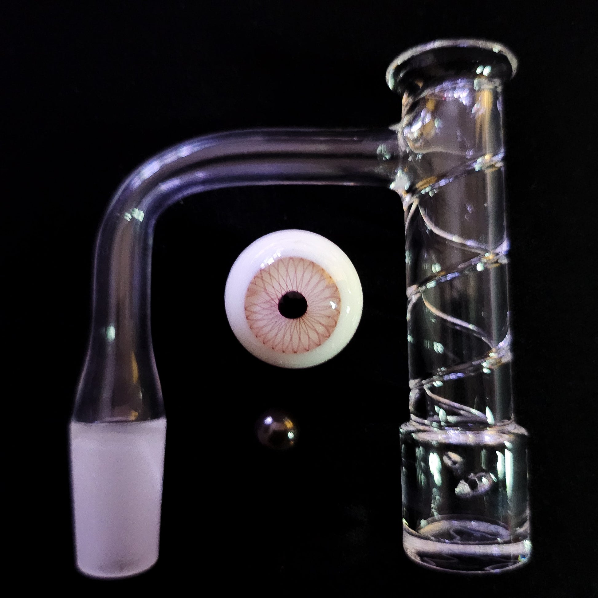 Featuring our new Spire Quartz banger, paired with our spooky black eye marble and an 8mm SIC pearl.