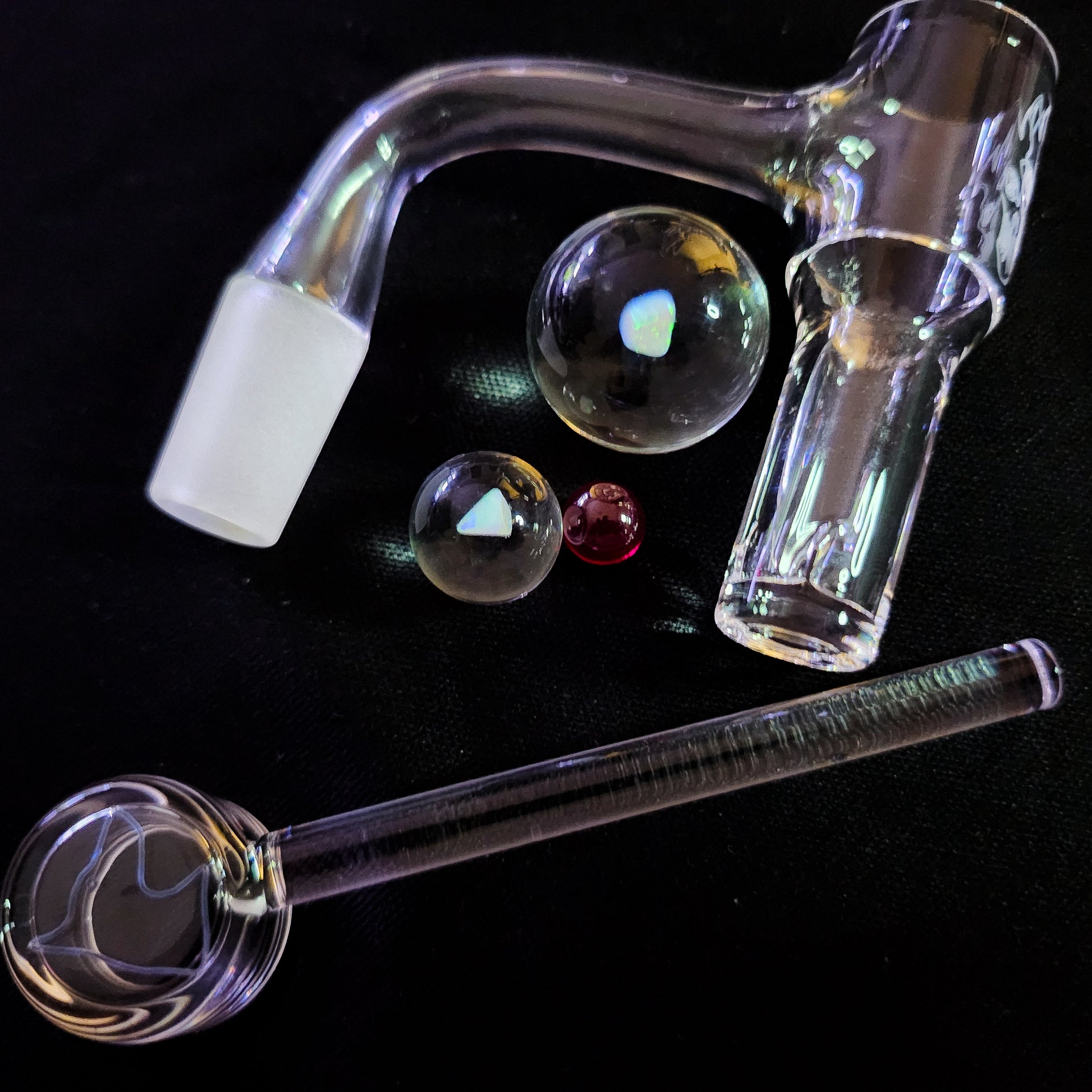 Featuring our new "Dishless" vortex quartz slurper & cap combo, paired with 2 ultra luxurious opal marbles and a 8mm ruby pearl, a truly deluxe combo.