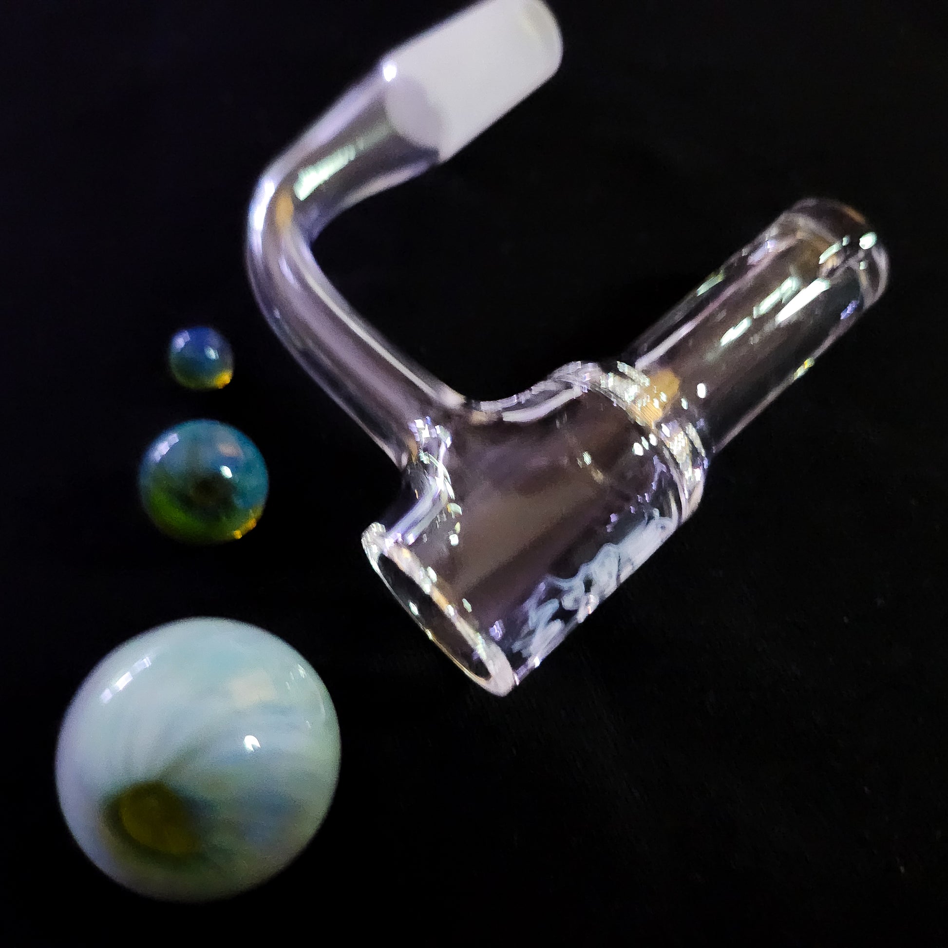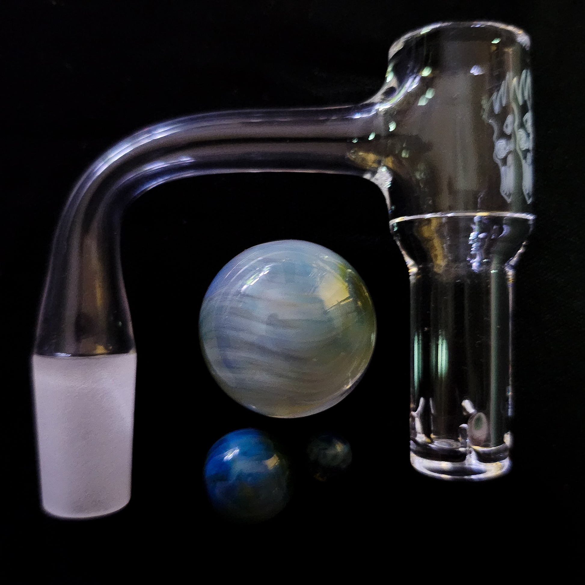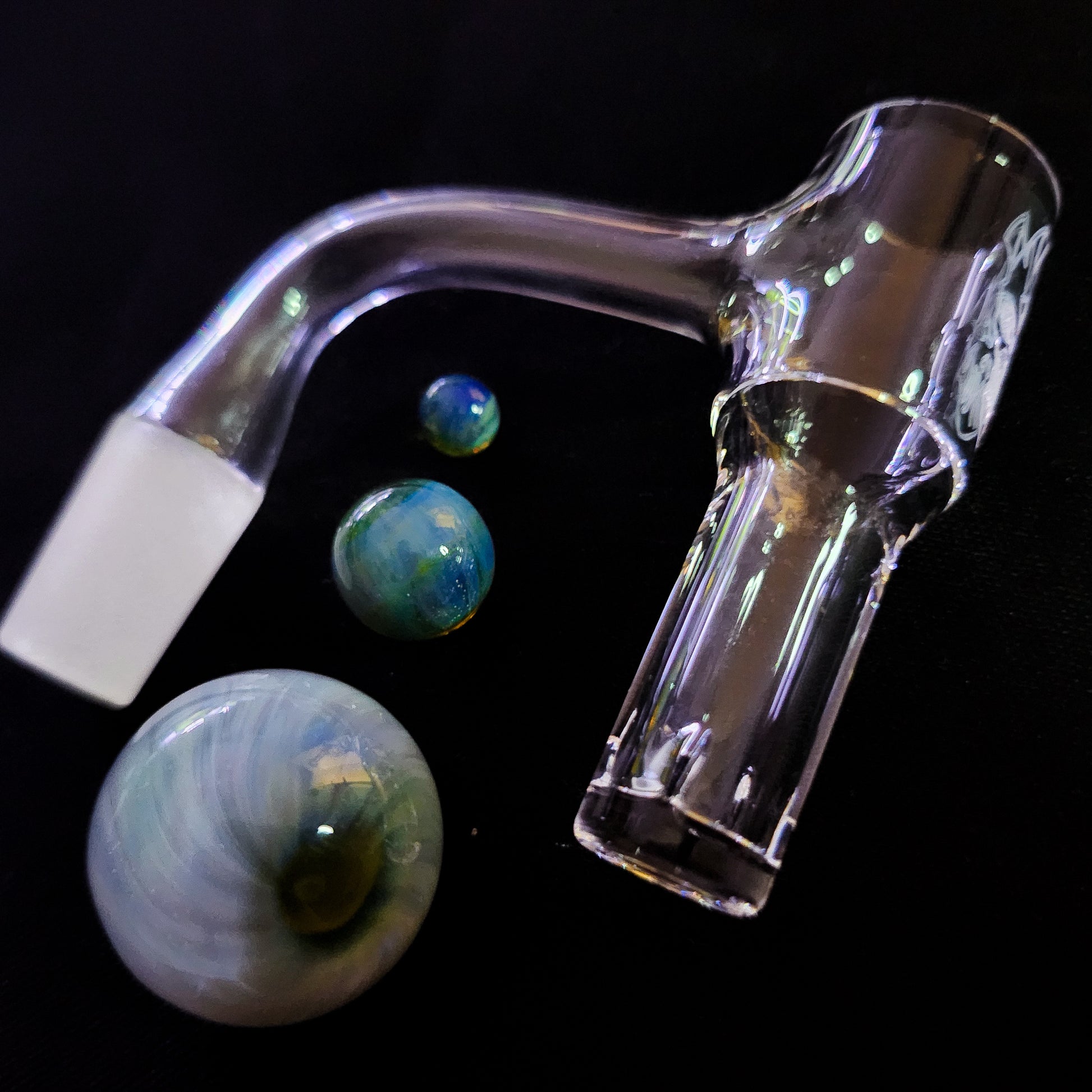 Featuring our new "Dishless" vortex quartz slurper & cap combo, paired with the Canadian-made Ethereal marble & pearl set from Guys Glass.