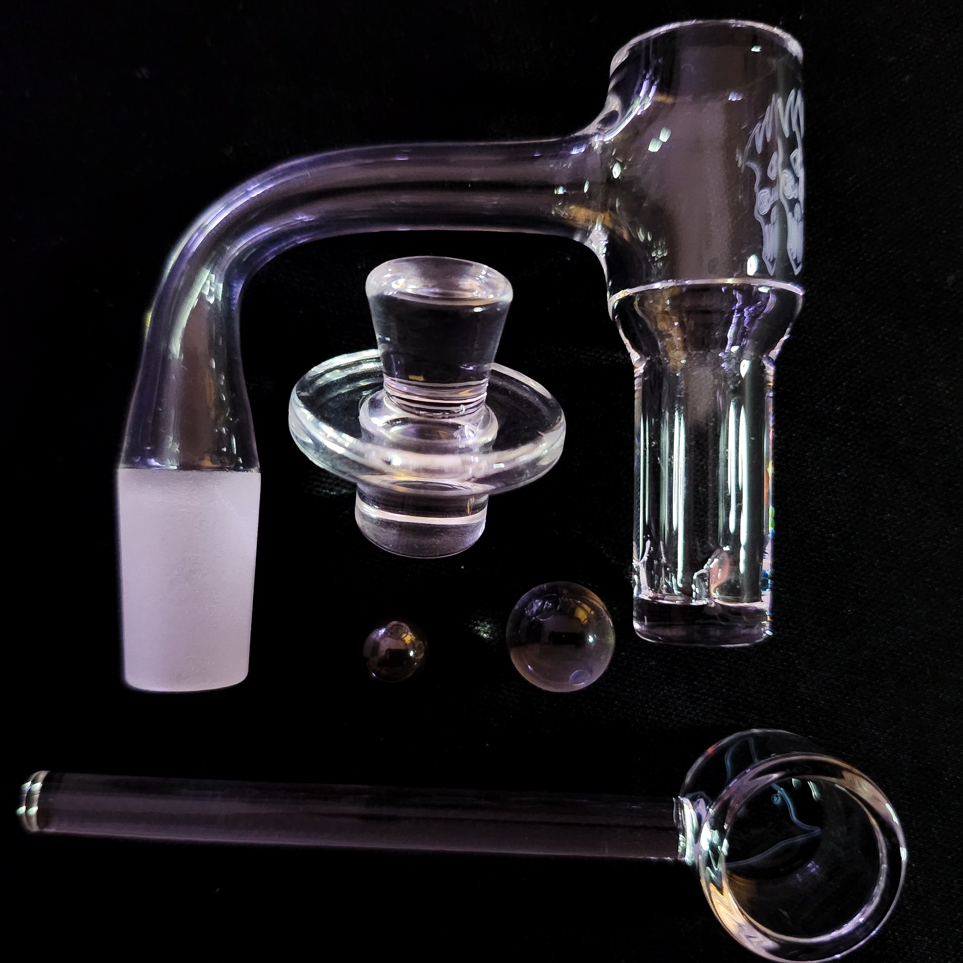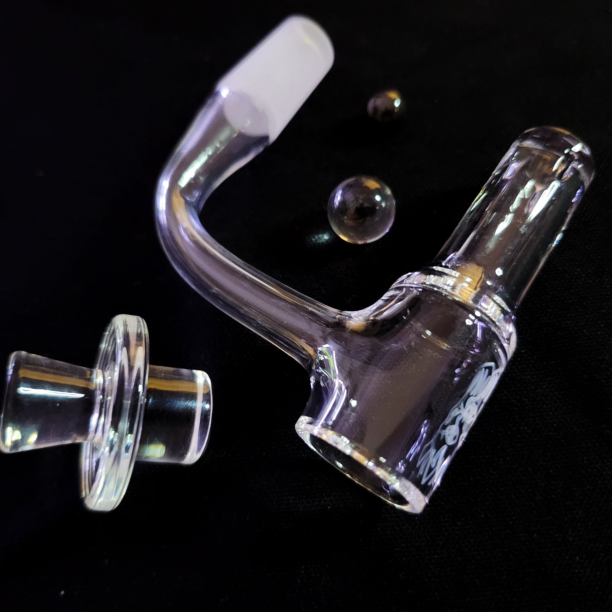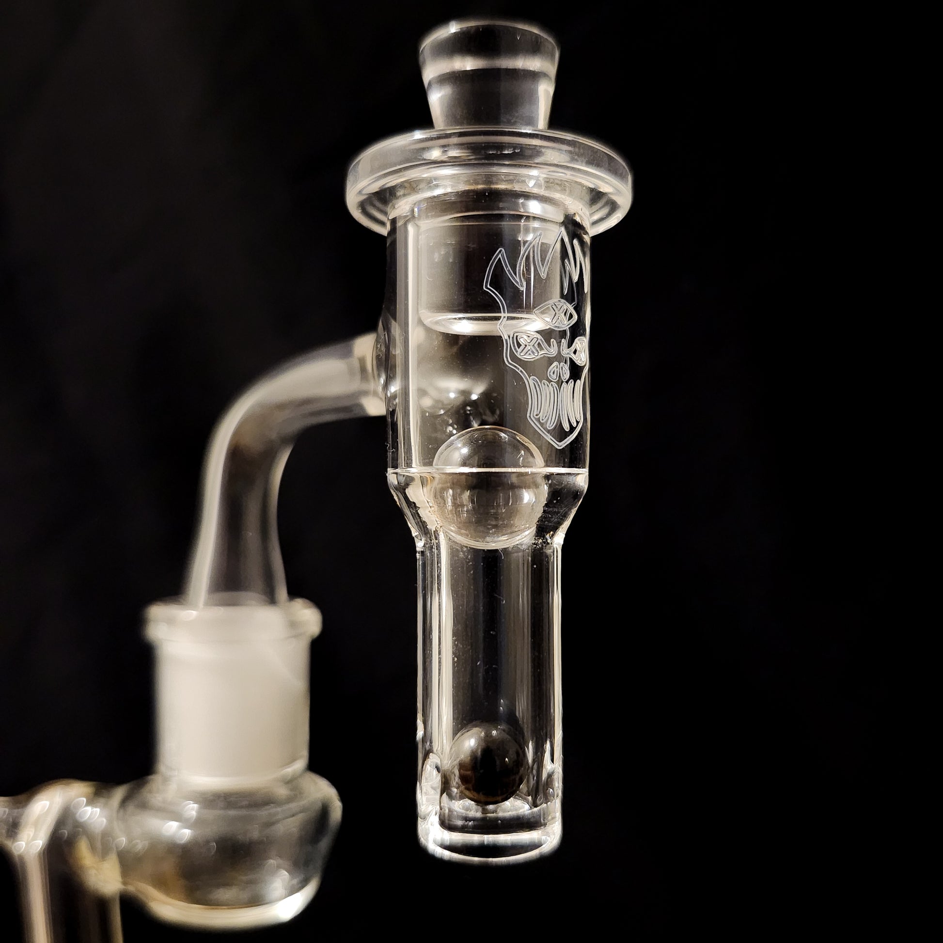 Featuring our new "Dishless" vortex quartz slurper & cap combo, paired with a 28mm Top Cap, a 12mm quartz valve and an 8mm quartz pearl.