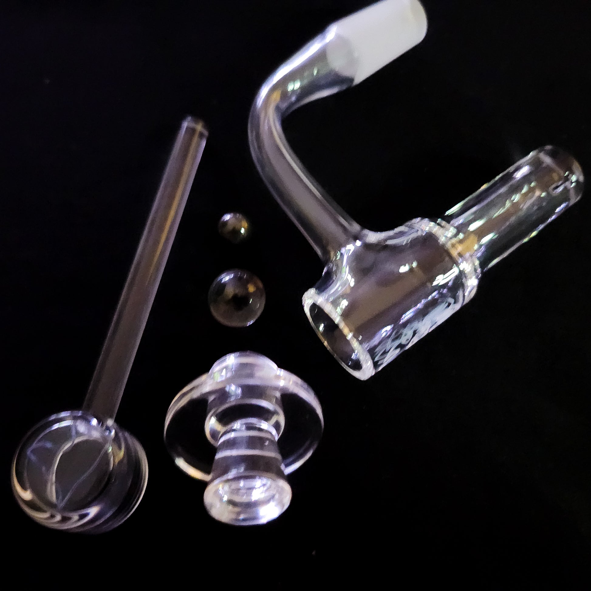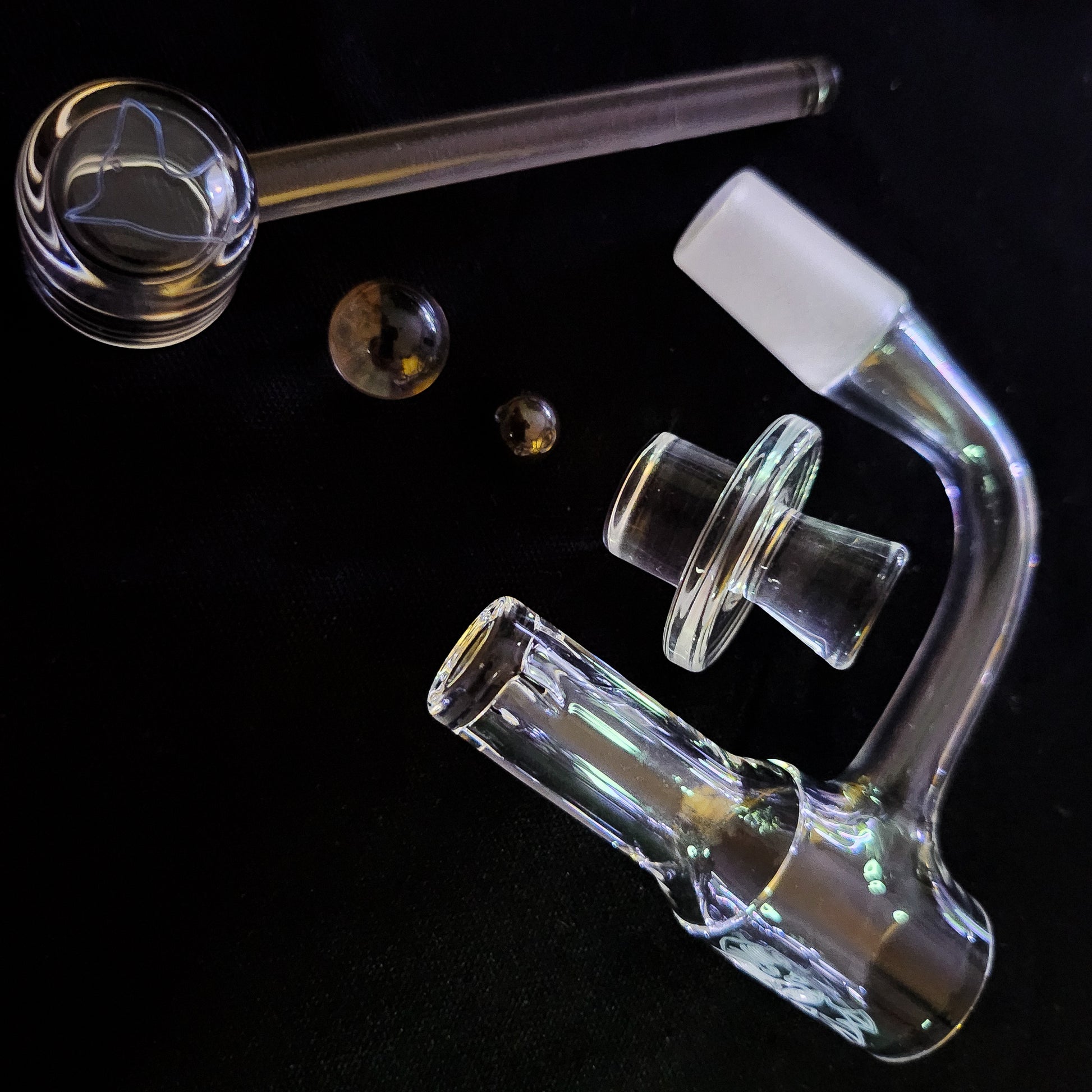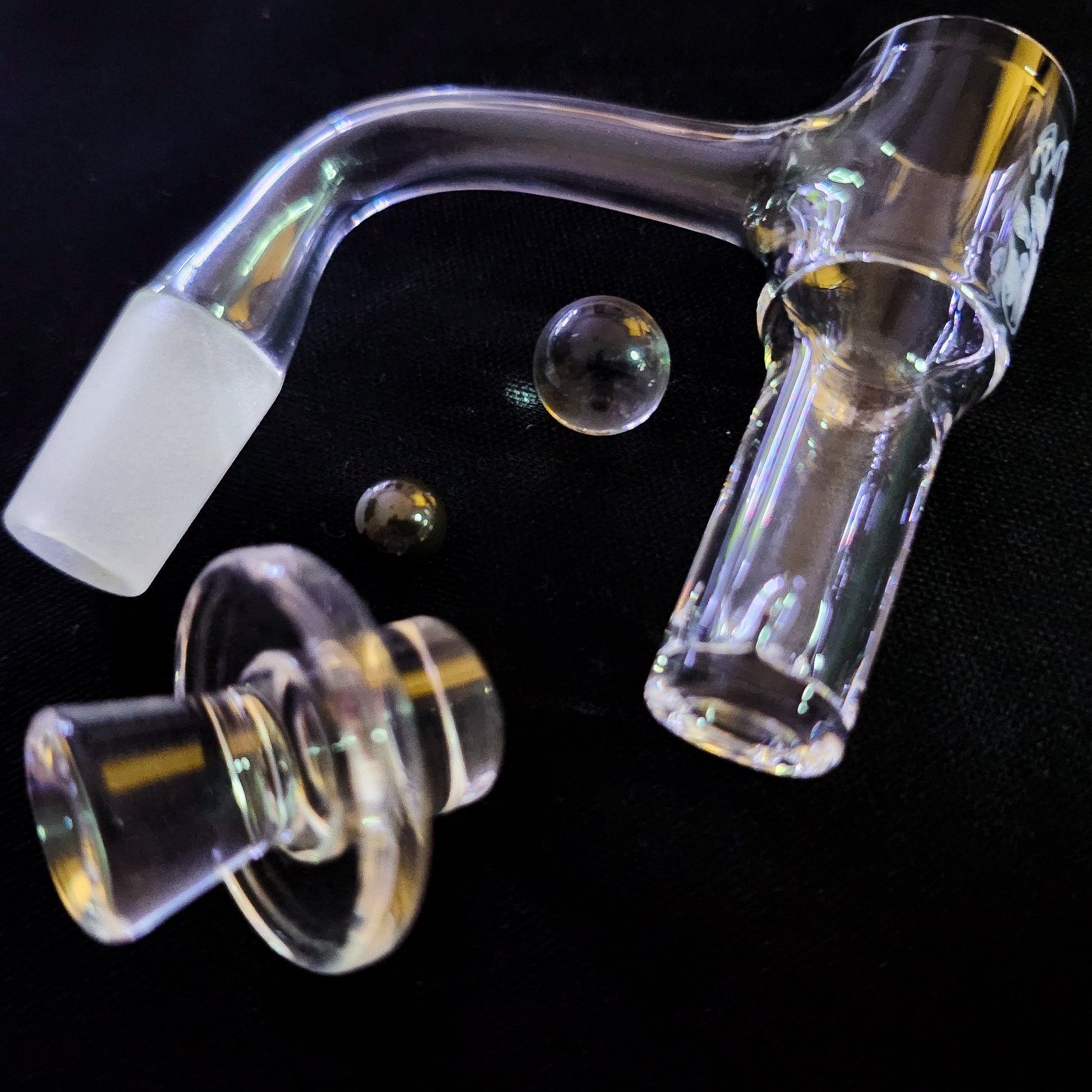 Featuring our new "Dishless" vortex quartz slurper & cap combo, paired with a 28mm Top Cap, a 12mm quartz valve and an 8mm quartz pearl.